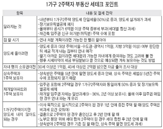 [중앙일보 조철현] 1가구 2주택자들의 시름이 깊어가고 있다. 올해 안에 집 한 채를 팔지 않으면 내년부터 양도소득세 중과(세율 50% 적용) 등 세금폭탄을 맞을 가능성이 크지만 최근 아파트값이 상승세를 타고 있어 섣불리 집을 내놓기도 망설여진다.이 때문에 1가구 2주택에 대한 양도세 중과 유예 완료일(12월 말)이 다가오면서 집 2채 중 1채를 팔아야 할지, 계속 보유해야 할지 고민하는 사람이 부쩍 늘고 있다.정부의 세제 강화 정책으로 다주택자들의 세 부담이 갈수록 커지고 있는 만큼 세금 규모 등을 꼼꼼하게 따져본 뒤 처분 여부를 빨리 결정하는 게 좋다고 전문가들은 조언한다. 박정현 세무사는 "2주택자 중 상당수가 내년 이후 집을 팔더라도 양도세 부담액 이상으로 집값이 뛸 수도 있다는 기대감에 선뜻 집을 팔지 못하는 것 같다"며 "계약하고 잔금 치를 시간까지 고려한다면 늦어도 11월 이전에 처분 여부를 결정해야 한다"고 말했다.◆세금폭탄은 피하고 싶은데…=내년부터는 1가구2주택에 대한 양도세가 50% 단일세율로 중과된다. 올 연말까지 집 한 채를 처분하면 양도세율이 보유기간에 따라 9~36% 적용되지만 내년 이후 집을 팔면 시세 차익의 절반을 고스란히 세금으로 내놓아야 하는 것이다.올해까지 한 채를 팔지 않으면 장기 보유 특별공제(3년 이상 보유시 10~45%) 혜택도 받지 못한다. 이에 따라 5년 전 3억원에 산 집을 6억원에 판다면 양도세가 올해는 8000만원이지만 내년에는 1억5000만원으로 껑충 뛰게 된다.보유세도 늘어난다. 집 두 채를 합친 가격이 기준시가로 6억원이 넘으면 내년부터 종합부동산세 대상이다. 더욱이 종부세의 과세표준적용률은 올해 70%에서 매년 10%포인트씩 올라가 2009년부터는 100%가 적용될 예정이다. 올해에 비해 2009년에는 두 배 이상의 보유세를 내게 된다는 얘기다. 이 때문에 전문가들은 "1가구2주택자의 경우 양도세 중과 등이 적용되지 않는 올해 안에 양도차익이 적거나 향후 상승가치가 떨어지는 주택을 처분하는 게 낫다"고 조언한다.1가구 3주택 이상 보유자들은 이미 올해부터 실거래가 과세뿐 아니라 양도 차익의 60%를 세금으로 내고 있다.◆양도세 중과 예외규정 알면 절세 보인다=집이 두 채 있다고 해서 내년부터 모두 양도세가 무겁게 매겨지는 것은 아니다.현행 세법에는 2주택자라도 중과세를 적용하지 않는 예외 규정을 두고 있어서다. 예컨대 수도권.광역시 소재 기준시가 1억원 이하나 그 외 지역 소재 기준시가 3억원 이하 주택은 양도세 중과 대상에서 빠진다. 따라서 내년 이후 어느 집을 팔더라도 기존의 양도세율(9~36%)을 적용받을 수 있다.하지만 현 시점에선 기준시가가 낮아 중과세 대상에서 빠지지만 내년 1월 발표되는 기준시가에서는 1억원이 넘을 수도 있다. 이 경우 양도세를 무겁게 물게 된다. 내집마련정보사 함영진 팀장은 "정부가 과세 현실화를 내세워 해마다 기준시가를 올리고 있어 현재 기준시가 9000만원인 집은 내년에 1억원 이상 될 가능성이 큰 만큼 매각 시기를 빨리 결정해야 할 것"이라고 말했다.재건축이나 재개발 입주권도 올해부터는 주택 수에 포함된다. 하지만 2005년 12월 31일 이전에 관리처분계획인가를 받았거나, 이미 관리처분이 떨어진 입주권을 지난해 말 이전에 구입한 것은 주택으로 보지 않는다. 따라서 기존 주택을 팔 때 중과세되지 않는다. 또 기존 재개발 조합원이 거주 목적으로 사업승인 이후에 추가로 주택을 구입했다면 1년 안에 입주권을 팔 경우 비과세 혜택을 받을 수 있다.◆팔기 아까운 집이라면=많은 시세차익을 누렸다면 파는 대신 세대 분리할 수 있는 자녀에게 증여하는 것도 고려해볼 만하다. 팔 때 부과되는 양도세에 비해 증여세가 적을 수 있기 때문이다. 세대 분리할 수 있는 자녀는 30세 이상이거나 30세 미만이더라도 결혼을 했거나 소득세법상 소득이 있는 경우다.이때 자녀가 증여받은 주택은 증여일로부터 올해까지는 3년, 내년부터는 5년 이상 보유한 뒤 매도해야 증여해준 부모가 양도세 중과를 피할 수 있다.집 한 채를 올해 파는 게 절세에서 유리한 것 같아도 처분과 보유 중 어떤 게 좋은지는 구체적인 사례에 따라 다르다고 전문가들은 말한다. 절세 노하우를 염두에 두되 보유.매도.증여 중 어느 쪽이 나은지는 세무사 등의 자문을 구하는 것이 좋다는 얘기다. 김종필 세무사는 "늘어나는 양도세와 보유세 부담보다 시세차익이 더 크다면 수익성에서 두 채를 계속 보유하는 게 나을 수도 있다"고 말했다.조철현 기자 choch@joongang.co.kr